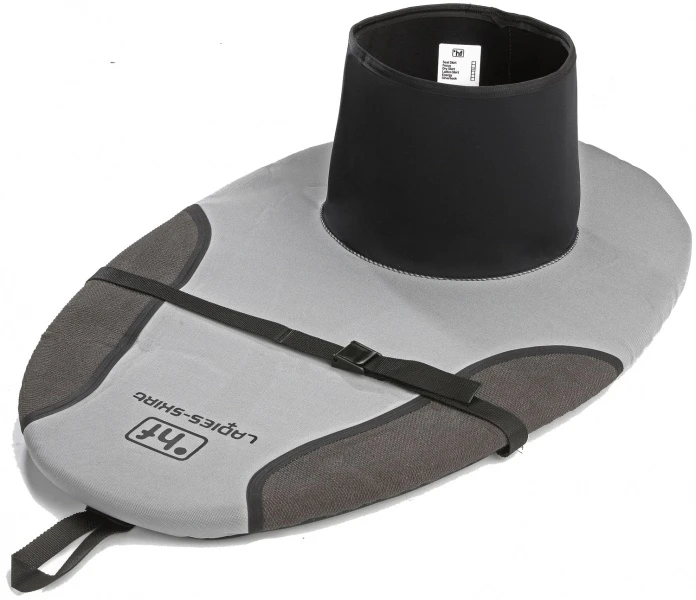 Neoprenspritzdecke speziell für Paddlerinnen: Der Schaft ist kürzer und konisch geschnitten und sitzt damit besser. Die Kevlar®-Verstärkungen sind nur an den Seiten, der Süllrandgummi ist mit weniger Vorspannung aufgenäht. Zum sicheren Öffnen sind ein Kniegurt sowie eine Griffschlaufe vorhanden.