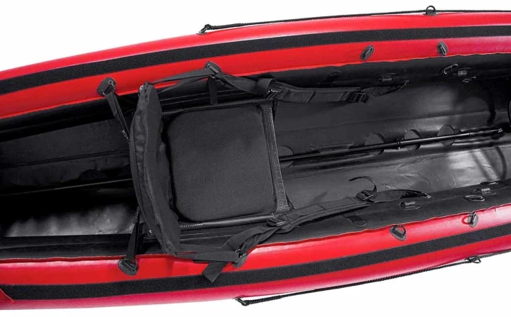 Mit Sitzpolster aus offenzelligem Schaum. Die Rückenlehne ist mit einem Aluminiumrahmen verstärkt, um auch Hochgewachsenen genügend Stabilität zu bieten. Die Lehne kann beim Verstauen/Lagern nicht im Boot verbleiben, sondern muss vor dem Zusammenfalten entfernt werden!