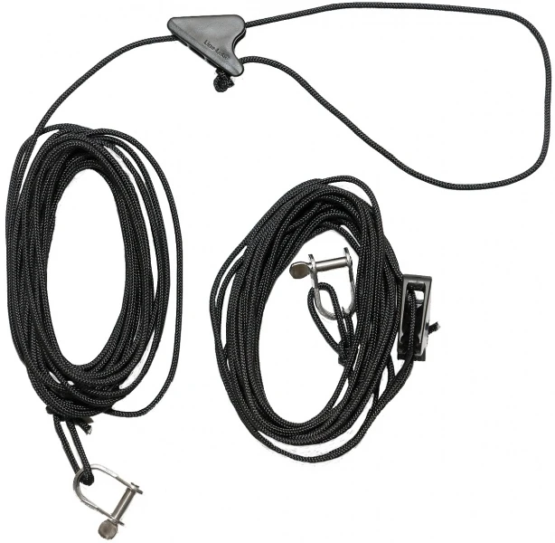 Steuerseile aus 2 mm Kernmantelseil mit Dyneema Kern, sehr robust und minimale Dehnung. 2 x 4 m lang (kann auf gewünschtes Maß gekürzt werden), kompl. mit zwei Schäkeln und Seilspannern.