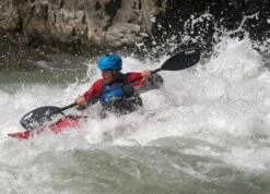 Vierteiliges Wildwasser Ersatzpaddel mit Glasfaserschaft und stabilen, aber angenehm leichten, verstärkten Polyamid Blättern, Länge 197 cm, Packlänge ca. 60 cm.